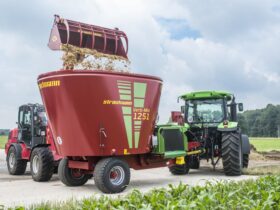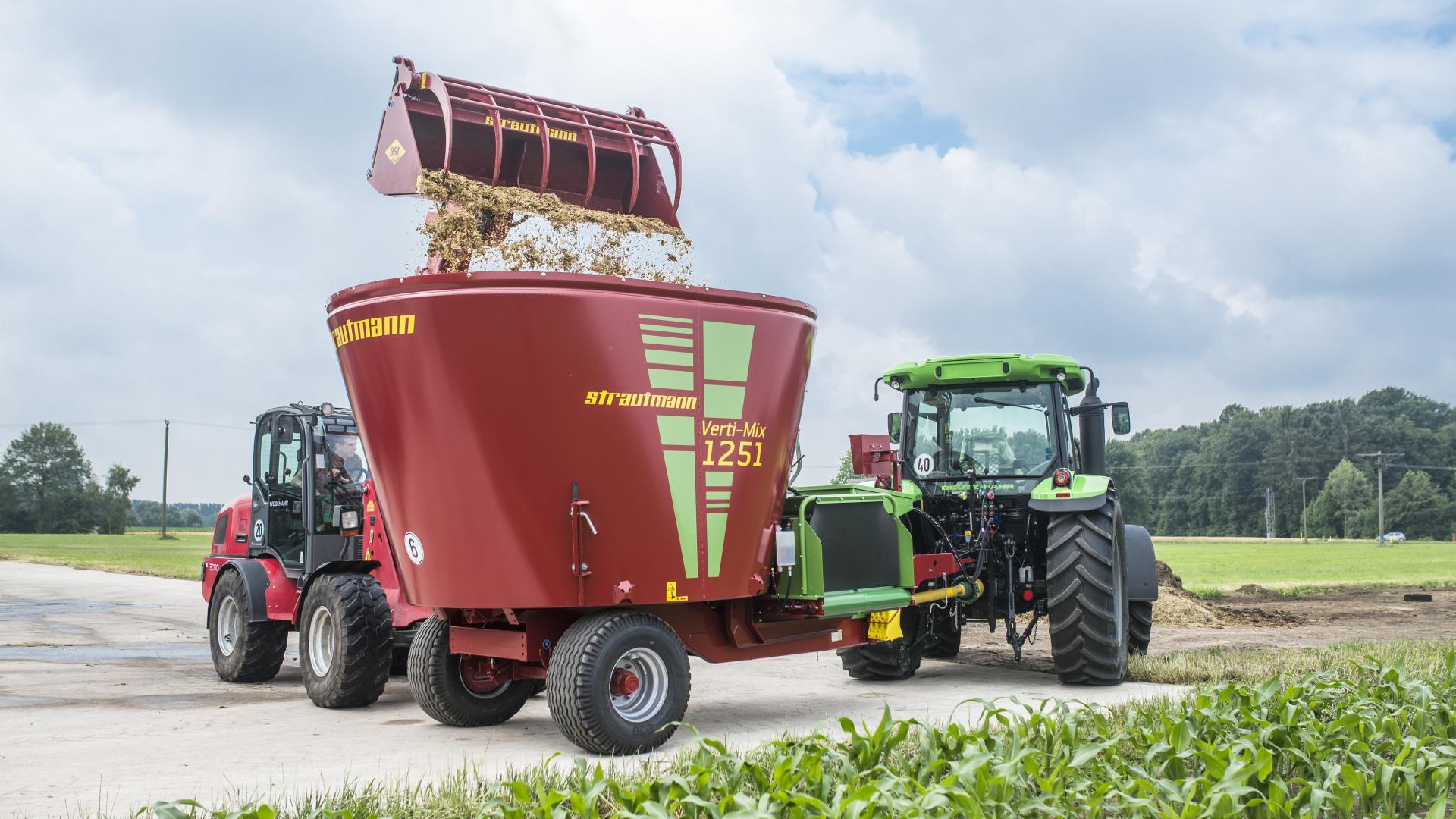 Fodder mixing, discharge and cubicle bedding – all in one. The mechanically powered straw blower throws the bedding mixture up to a width of 20 m into the stable.