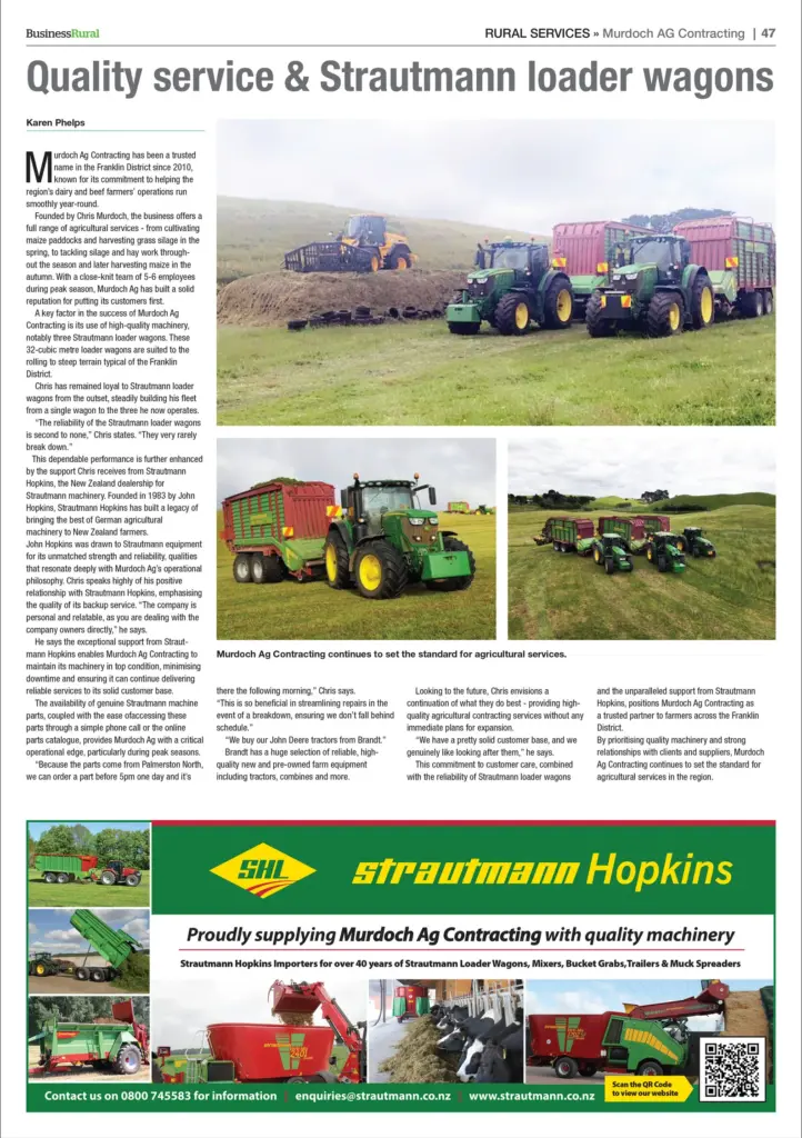 A key factor in the success of Murdoch Ag Contracting is its use of high-quality machinery, notably three Strautmann loader wagons. These 32-cubic metre loader wagons are suited to the rolling to steep terrain typical of the Franklin District.